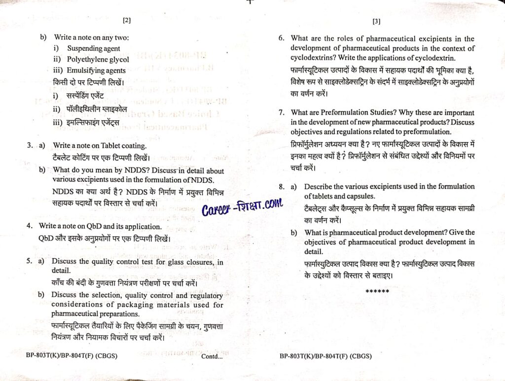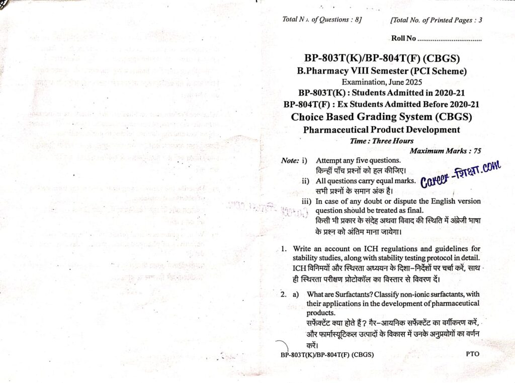 B.Pharma.(RGPV) Previous Year Question Paper BP-803T (K)/ BP-804T (F) Pharmaceutical Product Development (B.Pharmacy)