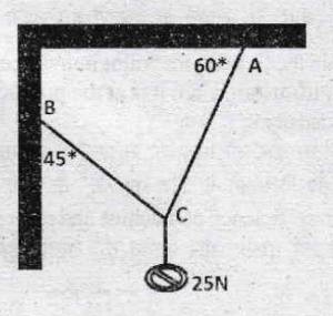 Q.8 An electric light fixture weighing 25 N hangs from A point C by two strings AC and BC. The string AC is inclined at 60° to the horizontal and BC at 45° to the vertical. Using Lami’s theorem, determine the forces in the AC and BC. 25 N वजन का एक विद्युत-प्रकाश फिक्सचर A बिंदु C से दो तार AC और BC से लटका हुआ है। डोरी AC क्षैतिज से 60° पर और BC ऊर्ध्वाधर से 45° पर झुकी है। लामी के प्रमेय का उपयोग करते हुए, AC और BC में बल ज्ञात करें। (RGPV 2022)