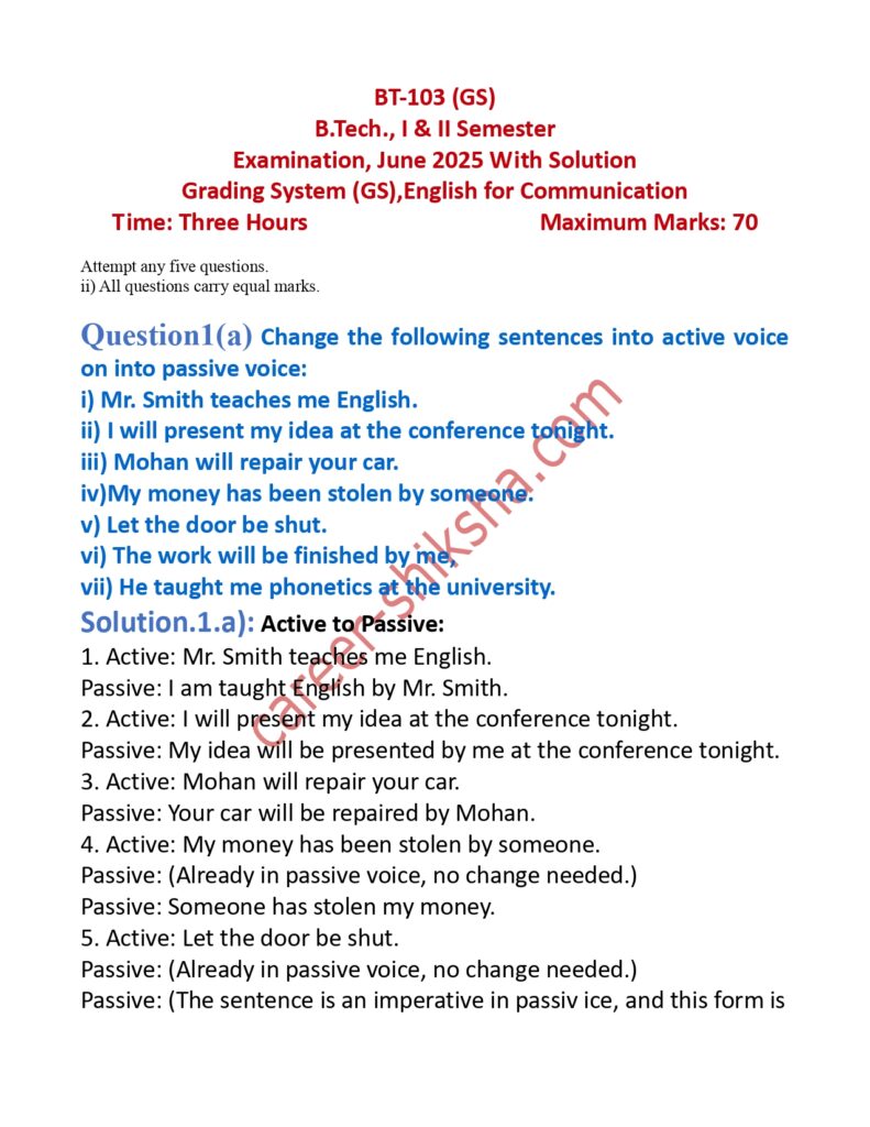 RGPV B.Tech. I & II Semester – June 2025 Question Paper Solution (BT-103) English for Communication (B.Tech.)