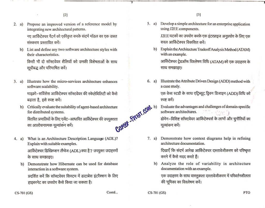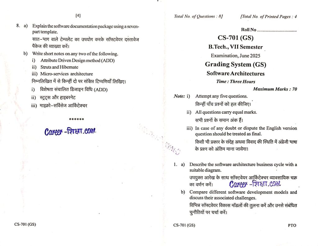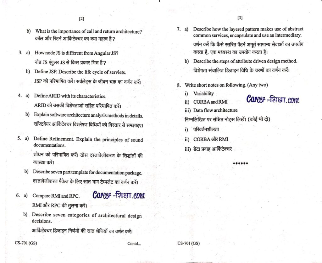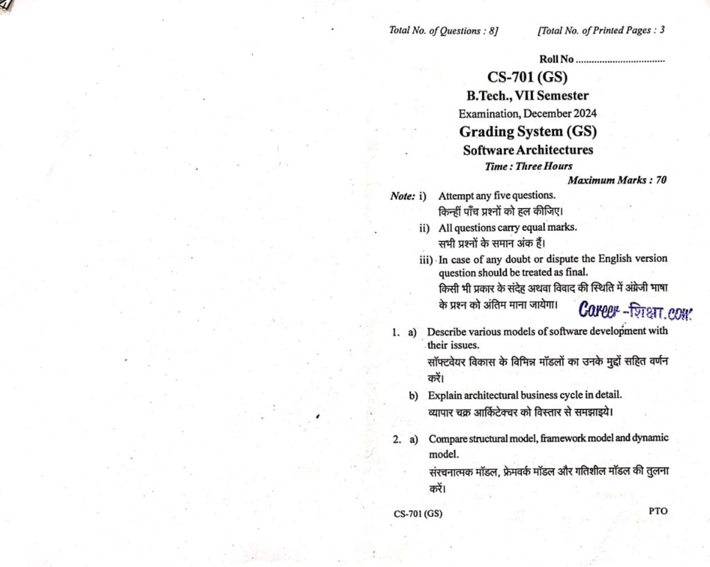 RGPV Previous/Old Year Question Paper CS-701 Software Architectures (B.Tech. VII Semester) for Computer Science Engineering Branch