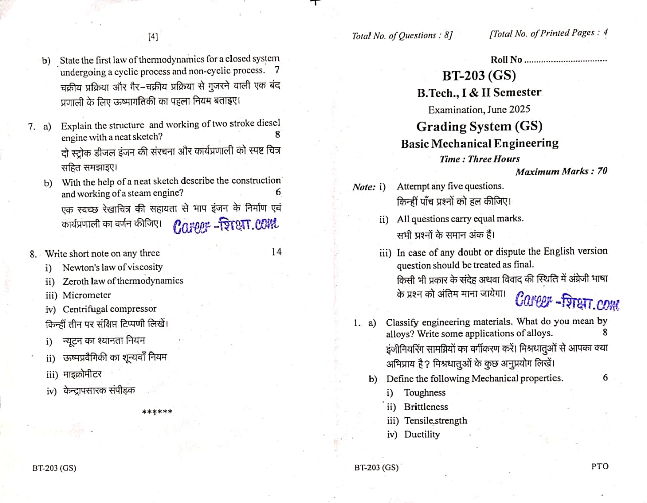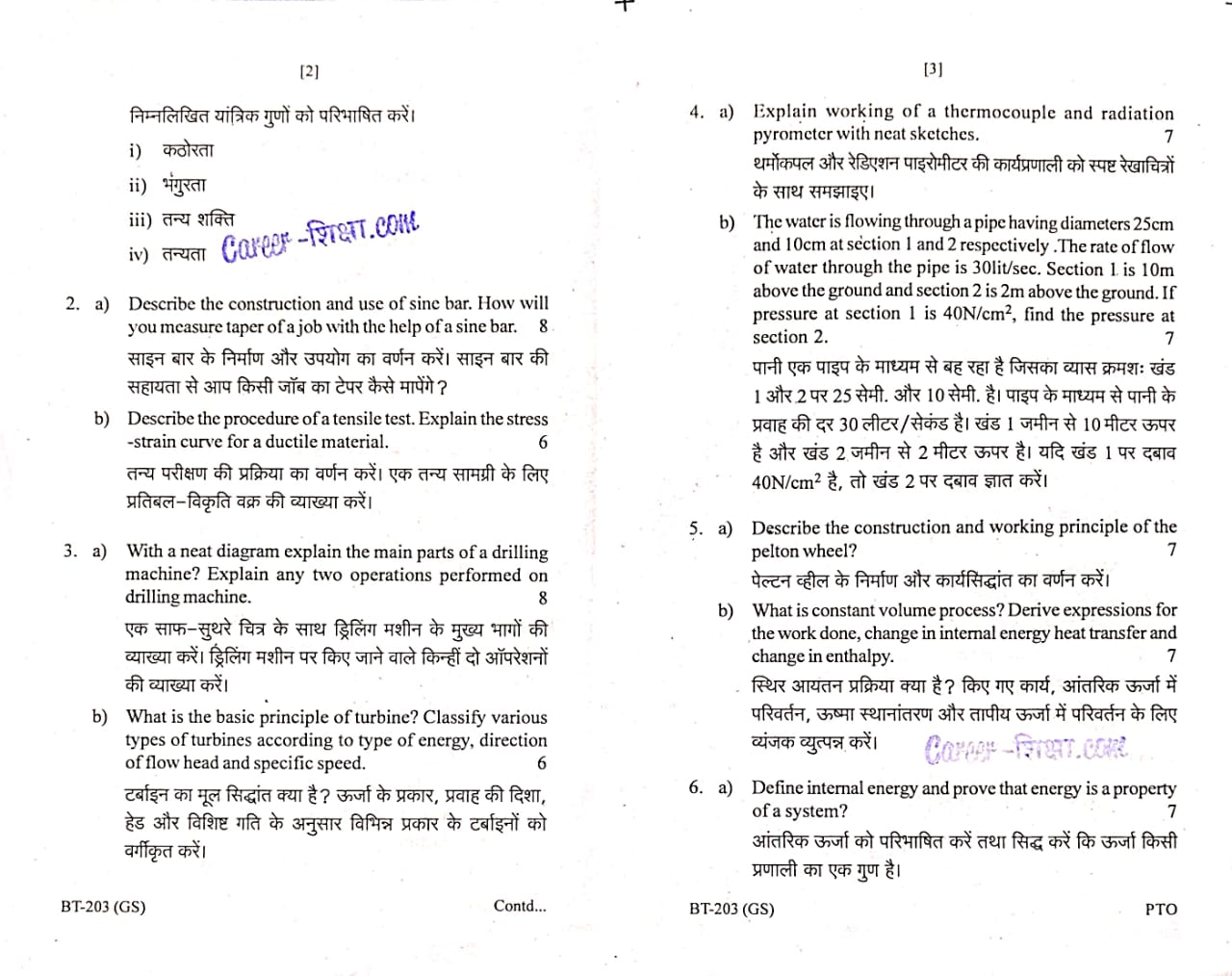 B.Tech. I & II Semester RGPV Previous(old) Year Question Papers, BT-203 Basic Mechanical Engineering
